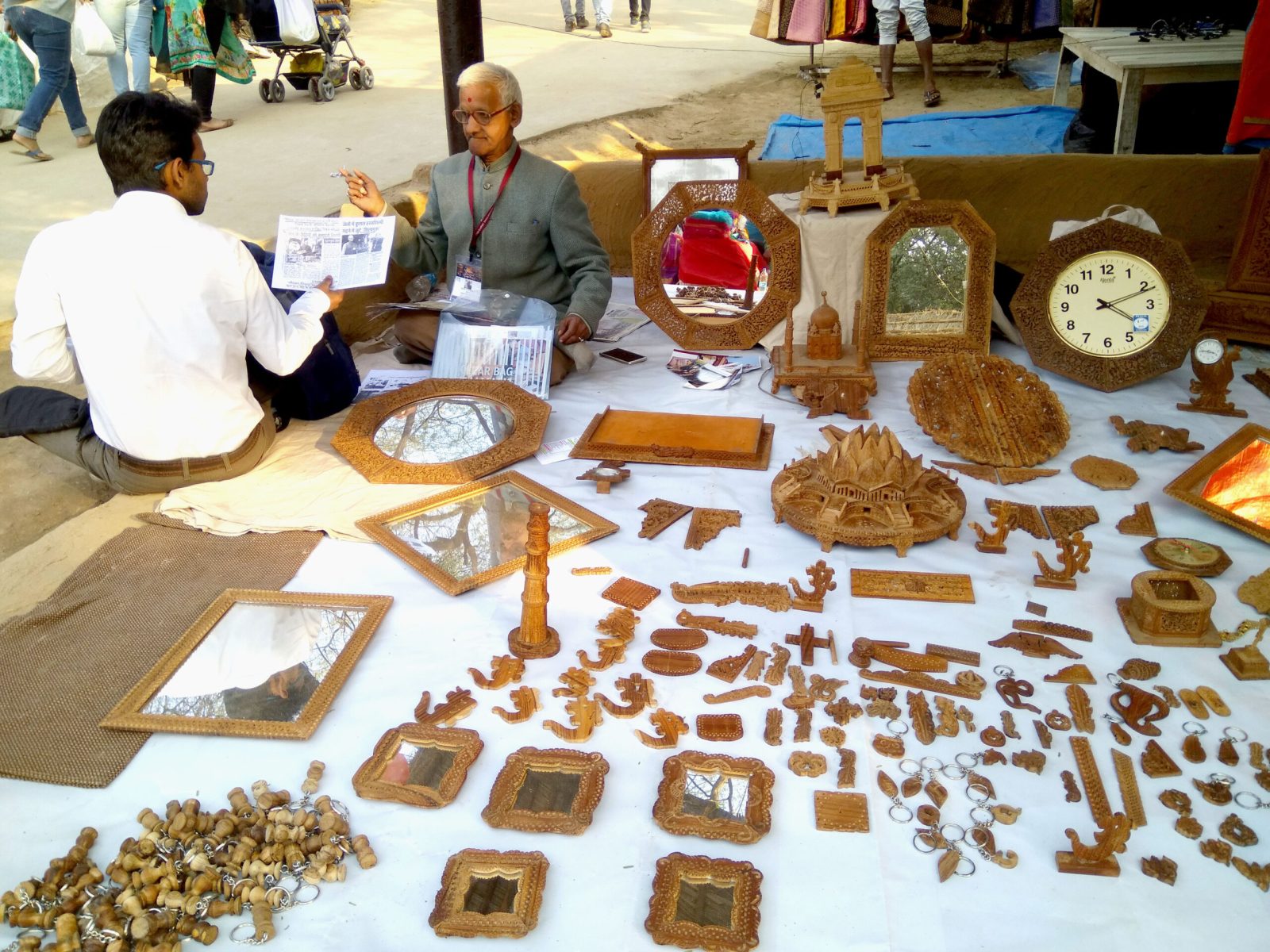 It was an honour to meet, 71 years old (rather young) art genius Pandit Mahesh Chand Sharma ji, who had been honoured as “Shilp -Guru” in 2007 by then Hon. President of India. In his stall, he is engaged carving a piece of wood to shape into a intriguing art for. Calm, balanced with a gentle smile on his face….his personality itself talk about vast experiences that he holds.