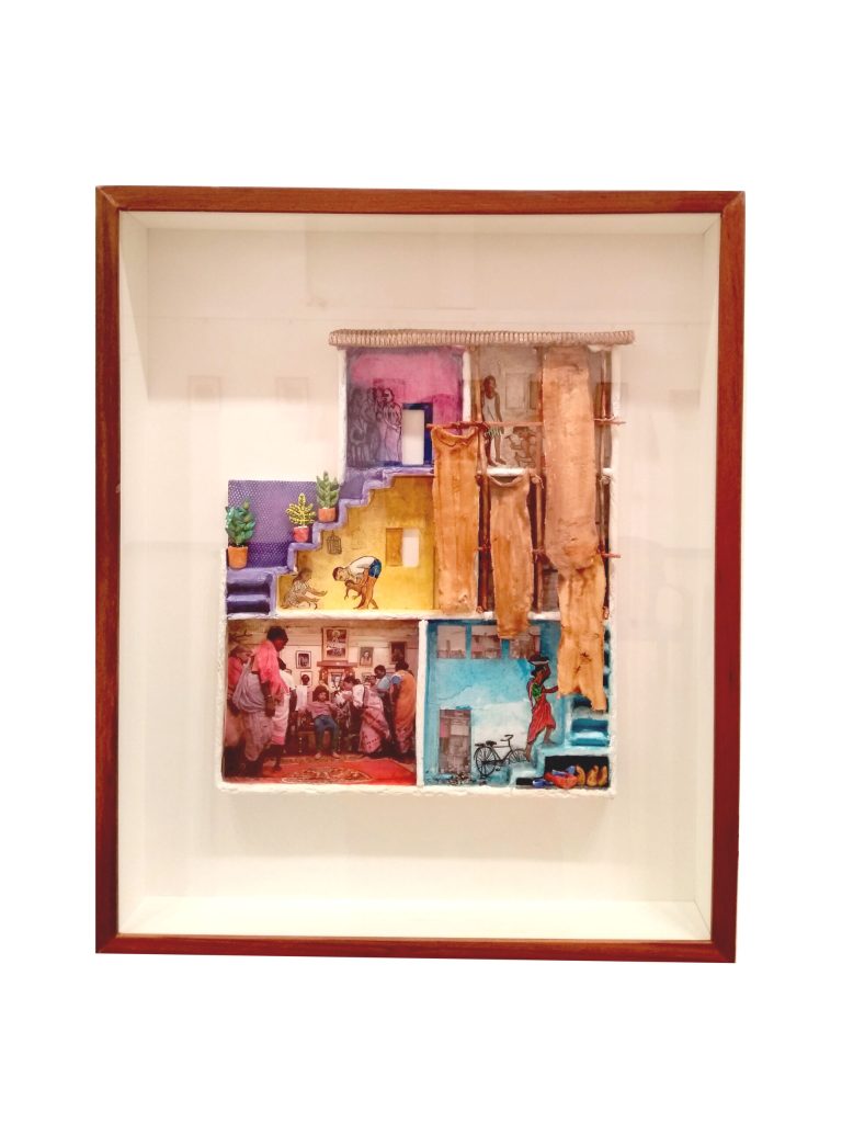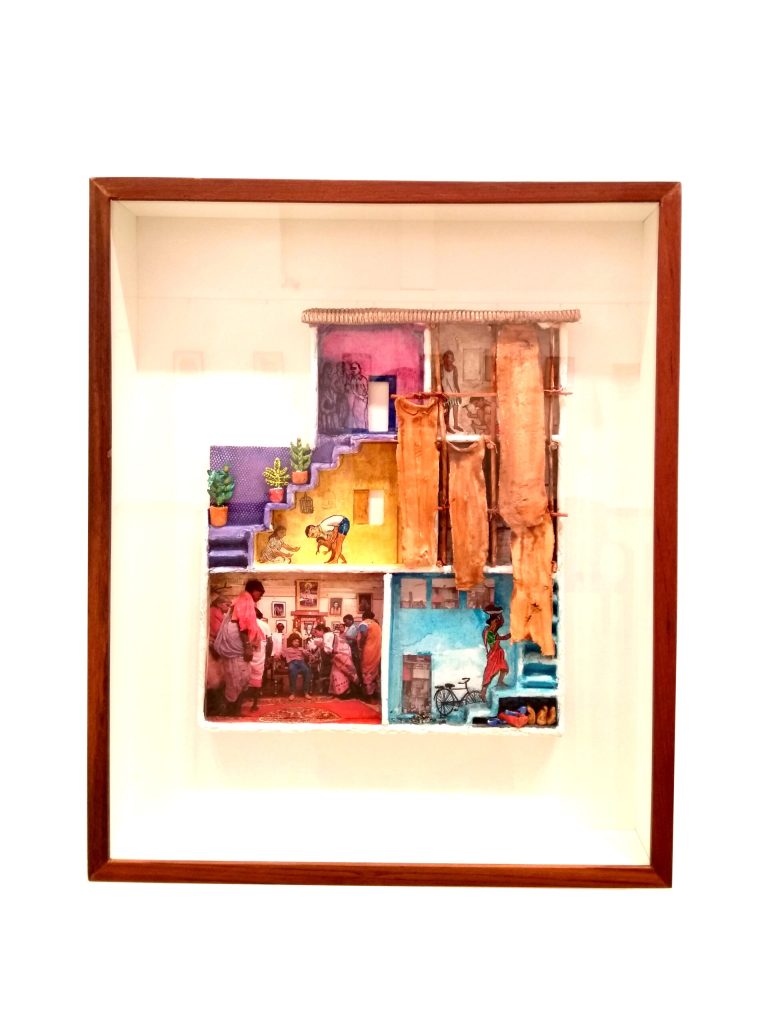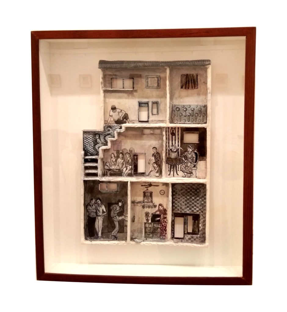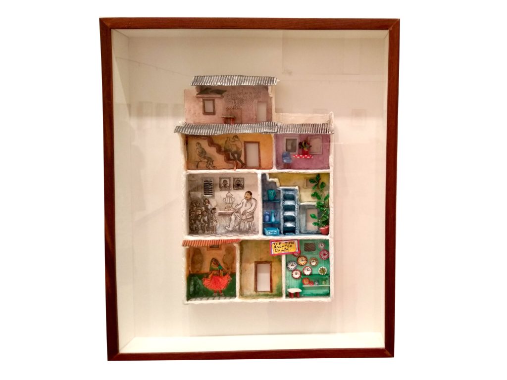 A semi-relief sort of work in papier mache gives the audience a glimpse of the bioscopic Mumbai life view.