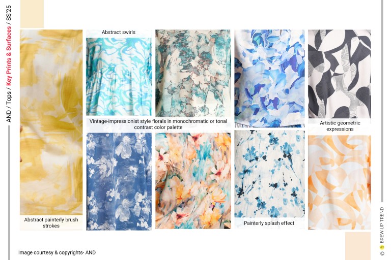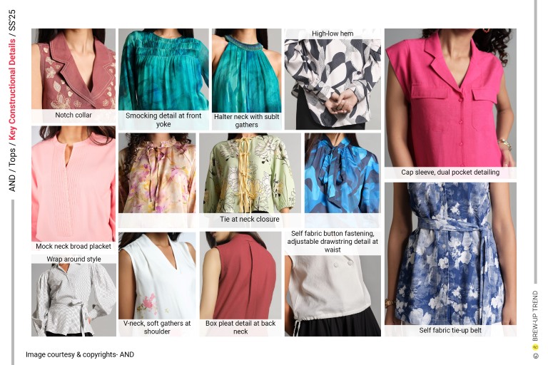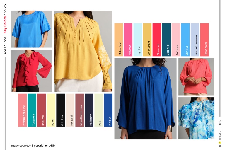 A refined expression of relaxed femininity defines the Spring Summer 2025 AND Tops collection, where fluid silhouettes and soft tailoring intersect with artisanal surface play. A compelling narrative of feminine fluidity emerges through artful construction and chromatic optimism. Painterly prints, romantic florals, and subtle embroidered textural interventions elevate everyday silhouettes into versatile wardrobe essentials. The overall mood balances comfort and elegance. The result is a sophisticated ease that prioritizes movement, texture play, and architectural details.