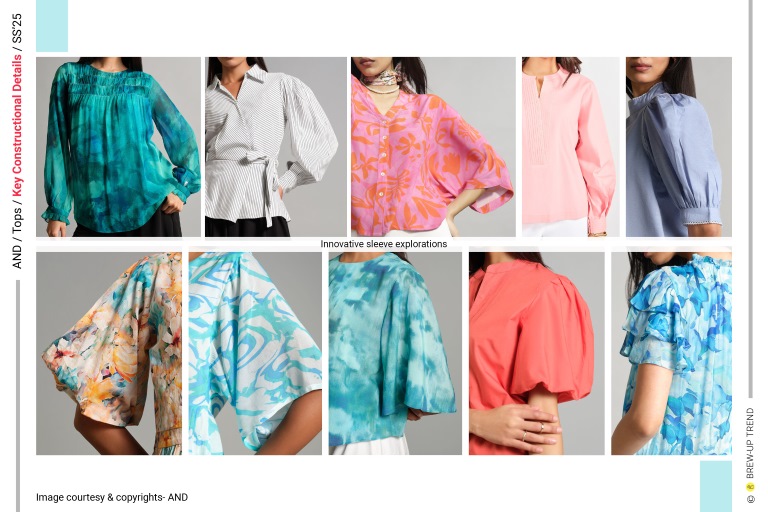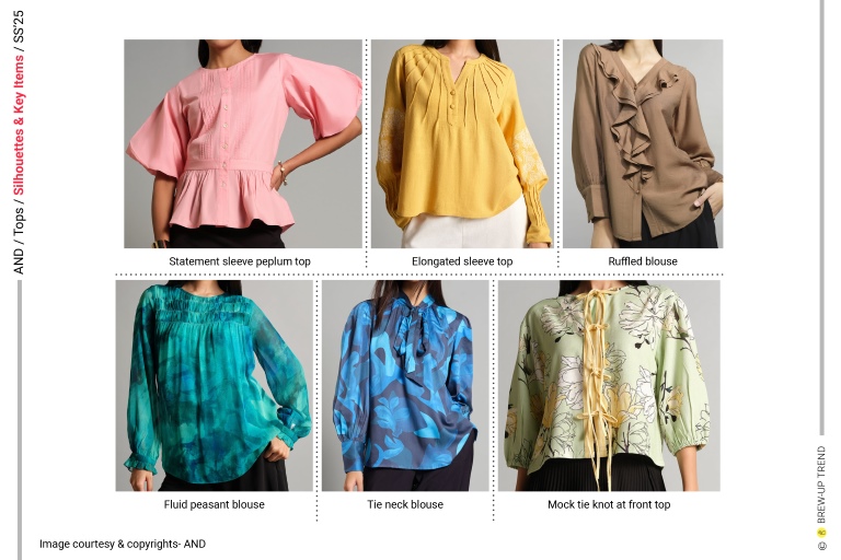 Construction highlights pintuck detailing along centre fronts and yokes, often radiating from necklines to create a strong vertical emphasis. Smocking at centre fronts and soft gathering at shoulders and necklines inject a sense of handcrafted intimacy, while tiered and cascading ruffles evolve into draped, cape-like expressions that feel elevated yet wearable. Sleeves play a central role, spanning puff, balloon, bishop, flutter, and kimono silhouettes, frequently finished with elasticated or softly gathered cuffs. Sleeve lengths range from full to three-quarter and short, including select styles with deep armholes and batwing constructions.