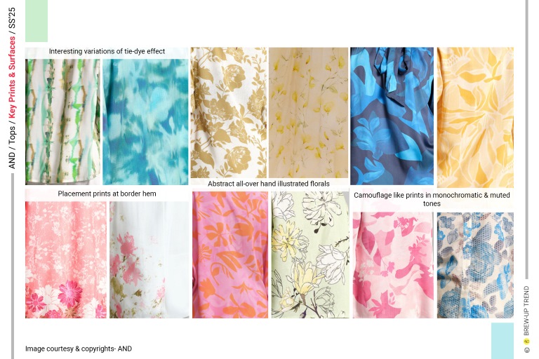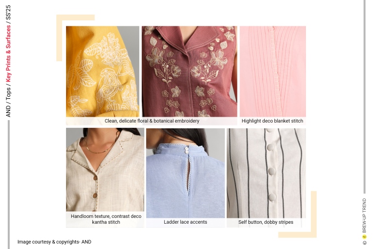 Surface design is led by floral and botanical narratives, articulated through painterly, watercolour, and hand-drawn aesthetics. Medium- to large-scale botanicals—spanning abstract, vintage, and impressionist styles—featuring hibiscus, tropical foliage, and garden blooms, appear predominantly in all-over placements. These are occasionally softened through tonal overlays and washed-out effects. Select styles introduce a creative tie-dye–inspired surfaces, intricate floral embroideries, highlighted Deco blanket stitching along the placket edge, ladder lace insert at neck and cuff edges and contrast running Kantha stitches layered over dobby stripes. Engineered placement prints emerge as a key, attention-grabbing surface detail, elevating visual impact and craftsmanship.