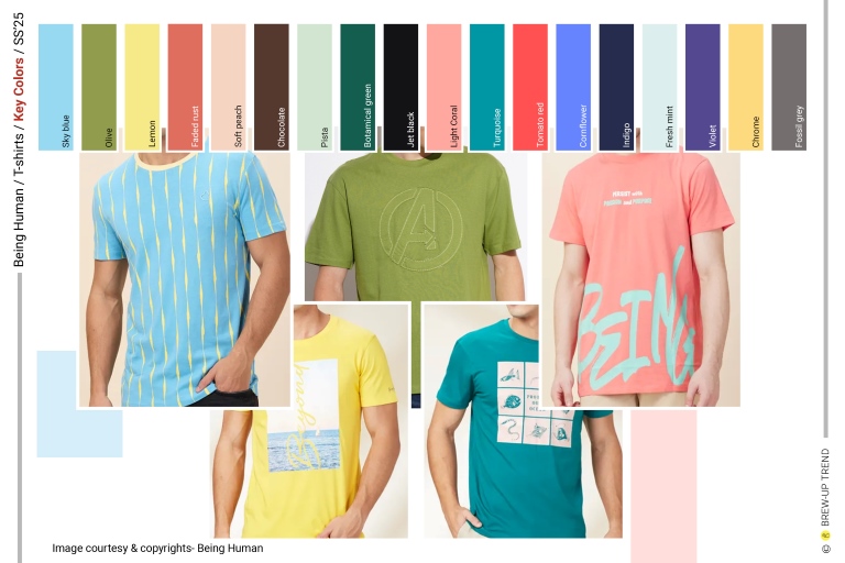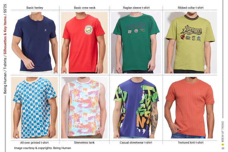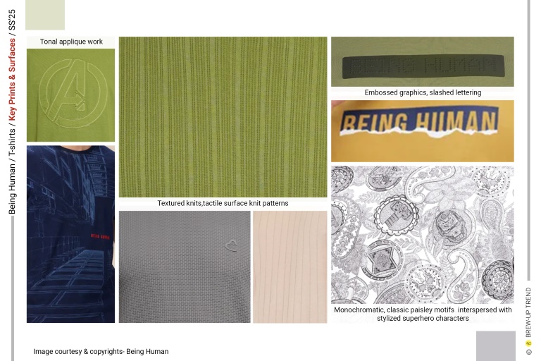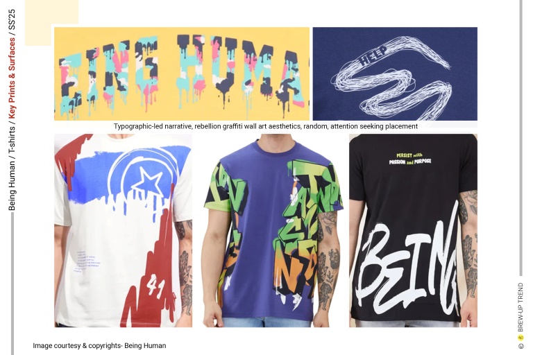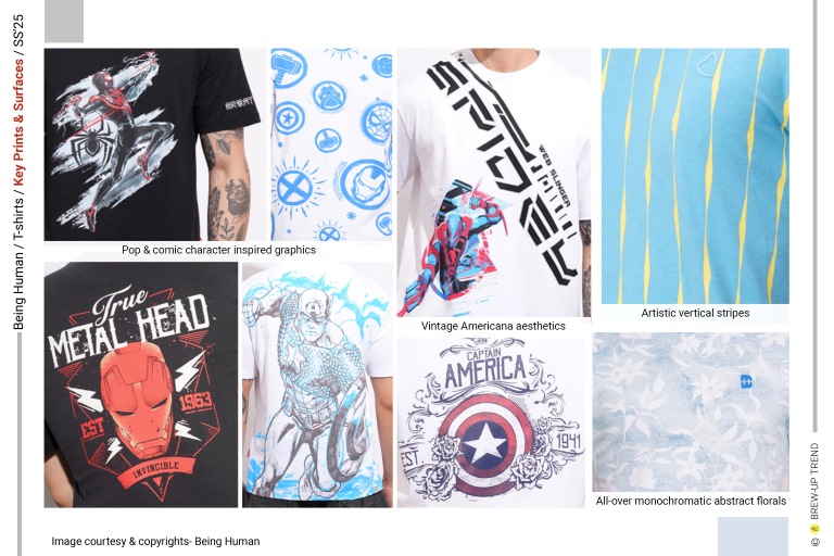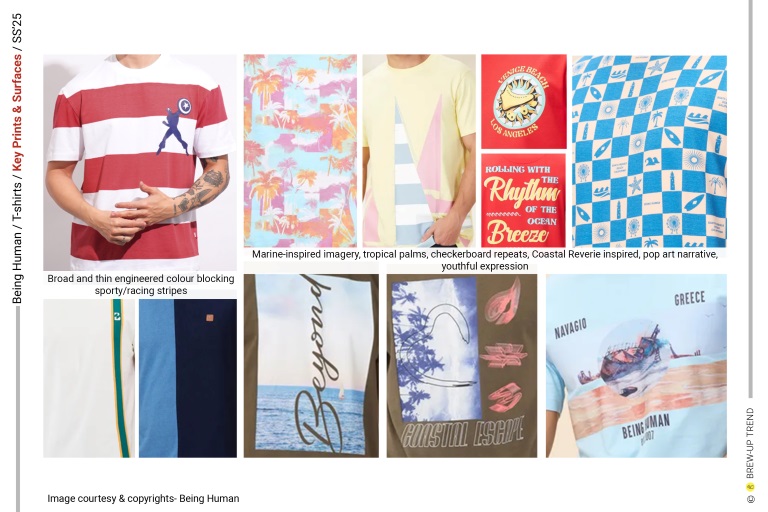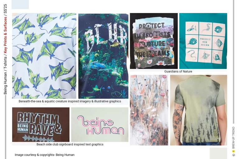 Being Human Spring Summer 2025 T-shirts collection is about contemporary graphic audacity. The overarching narrative is one of optimistic escapism—maritime references, nature imagery, and retro sportswear codes converge to create a wardrobe rooted in leisure and self-expression. Four dominant themes emerge: Coastal Reverie, characterized by ocean graphics, tropical florals, and sun-faded pastels that evoke endless summer; Guardians of Nature, characterised but Love for nature and its protection slogan graphics; Wild Escapism, highlighted through graphics inspired by mountaineering and finally Comic Love where oversized typography, comic-inspired illustrations (Marvel Characters), and layered digital prints command attention. Silhouettes remain deliberately uncomplicated: classic crew necks dominate, with occasional contrast-ribbed collars and shoulder taping adding athletic references. Washed effects, engineered placements, and textural surfaces elevate everyday tees into statement pieces, reflecting a confident, youth-driven casualwear mindset rooted in self-expression and lifestyle identity.