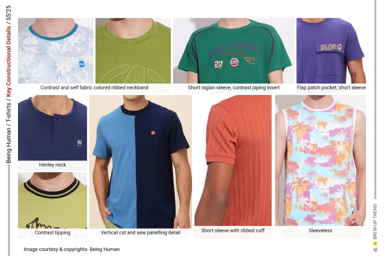 Key items include basic crew necks, henleys, and raglan-sleeve tees, elevated through contrast-ribbed collars, shoulder taping, and washed effects that lend athletic authenticity. All-over printed tees, textured knit styles, and sleeveless tanks expand the lineup. This silhouette strategy balances timeless simplicity with expressive surface design, embodying optimistic escapism and lifestyle identity rooted in contemporary graphic audacity.Claude is AI and can make mistakes. Please double-check responses.