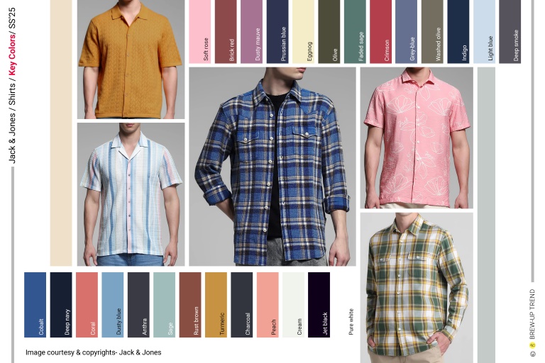 Silhouettes are anchored in comfort-first proportions, balancing relaxed regular fits with softly loose profiles that support effortless layering. The range spans classic full-sleeve shirts with eased shoulders, resort-collar half-sleeve styles designed for high-summer wear, and sachket shirts that blur the boundary between shirting and outerwear. Utilitarian overshirts with exaggerated double-flap or multi-pocket constructions introduce structure, while straight and curved hem options allow flexibility for tucked or untucked styling. Full zip–front shirts add a contemporary streetwear edge, enhancing modularity. All over print shirt, Schiffli, Seersucker and dobby-textured shirts deliver airy volume without weight, ideal for warm climates, while plaid and chord-check along with Denim shirts, styles provide familiarity. Collectively, these silhouettes prioritise ease, versatility, and cross-seasonal layering, ensuring strong wardrobe integration and lasting commercial relevance.