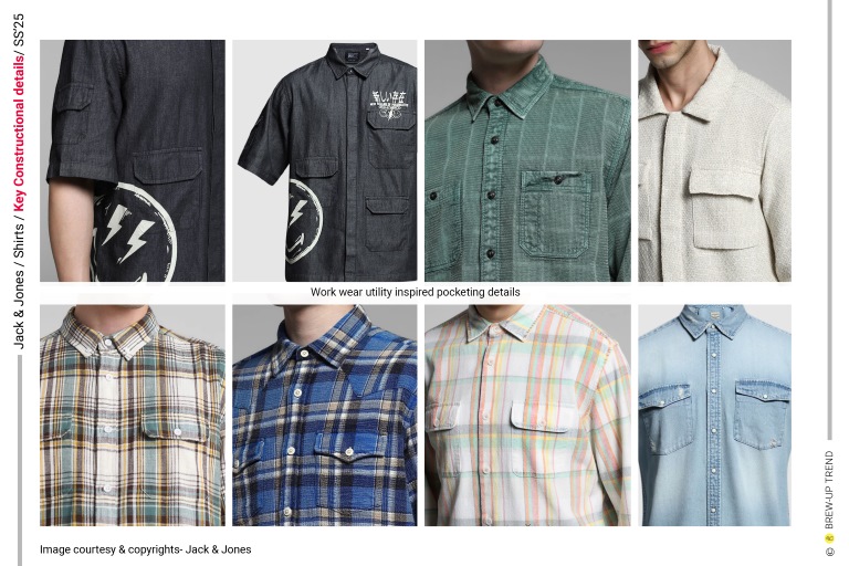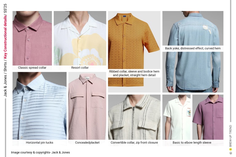 Key constructional detail include: Classic spread collar, resort collar, conceal placket, convertible collar, zip front closure, horizontal pin tucks, back yoke, distress effect, curved, scoop hem, ribbed collar, sleeve and bodice hem and placket, straight hem detail, workwear, utility inspired pocketing detail.