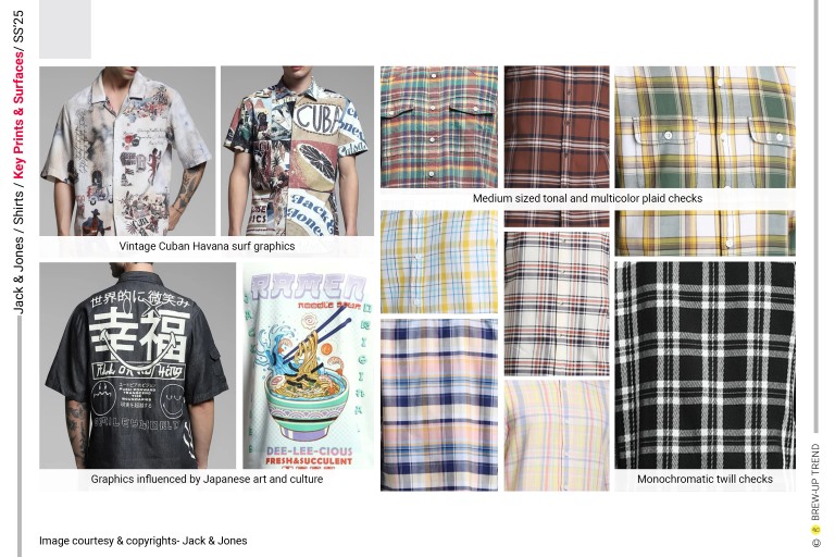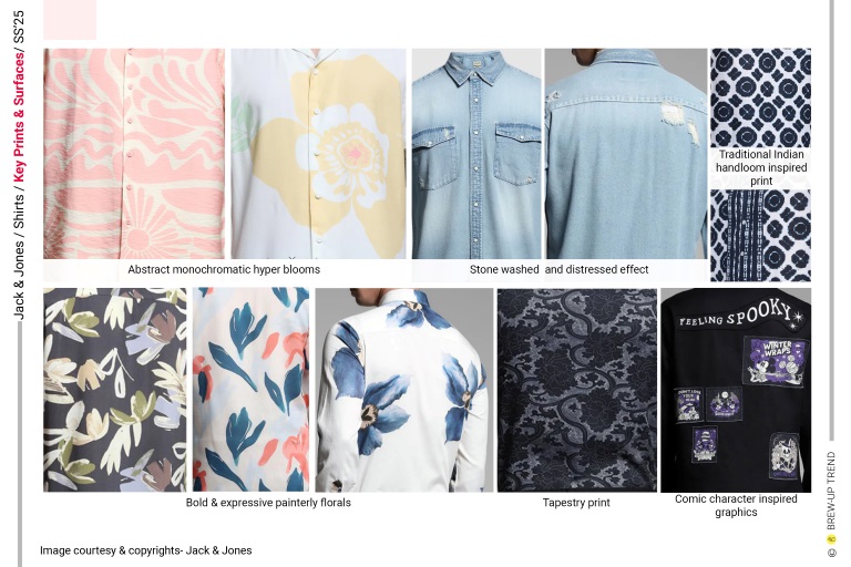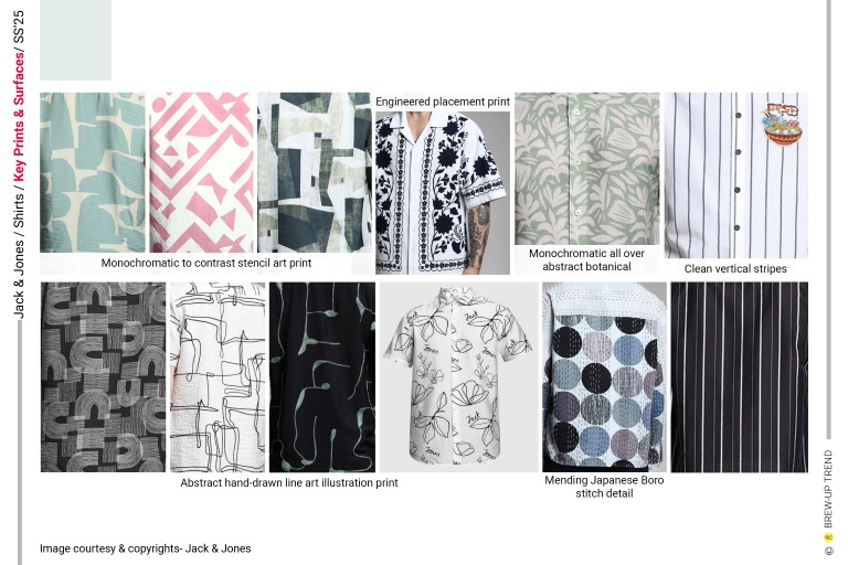 Jack and Jones’ SS25 shirt collection strikes a confident balance between nostalgic craft and contemporary street aesthetics, reflecting a generation’s pursuit of authentic self-expression. The range articulates a poised dialogue between expressive surface storytelling and commercially grounded silhouettes, navigating seamlessly between resort-led ease and street-aware utility. Graphic intelligence and fabric innovation anchor the collection’s relevance, with visual cues drawn from Japanese art and culture inspired graphic minimalism, retro Americana, and contemporary street culture, layered with deliberate artisanal imperfection. Raw-edged patchwork, deco-style mending stitches, and washed-back finishes signal an anti-perfectionist attitude, while engineered florals and intricate schiffli work showcase technical finesse. Maximalist pop graphics coexist with muted watercolor abstractions, as structured utility silhouettes soften through resort collars and comfort-driven fits. Sacket shirts sit alongside breezy resort styles, reinforcing versatility across city-to-holiday contexts. Overall, the mood is relaxed yet intentional, positioning the collection as elevated casualwear with strong visual memorability and repeat commercial potential.