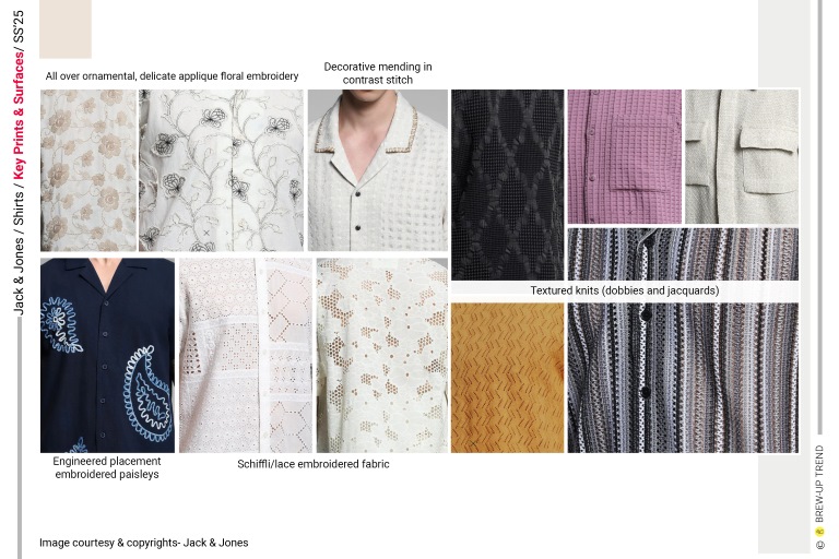 Key Prints and surfaces include: eyelet embroidery like schiffli fab, embroidered paisleys, ornamental delicate florals in applique embroidery, decorative mending in contrast stitch thread, textured knits and woven fabrics, abstract botanical and stencil art like monochromatic prints, engineered placement prints, abstract hand drawn line like art illustration, mending Japanese boro stitch, clean fine line verticle stripes, vintage Cuban hawana surf graphics, medium sized tonal to multicolour plaid checks, Japanese art and culture inspired graphics, bold and expressive painterly florals, tapestry prints, comic character inspired graphics patch placements.
