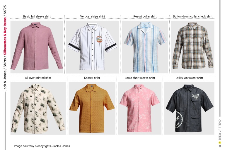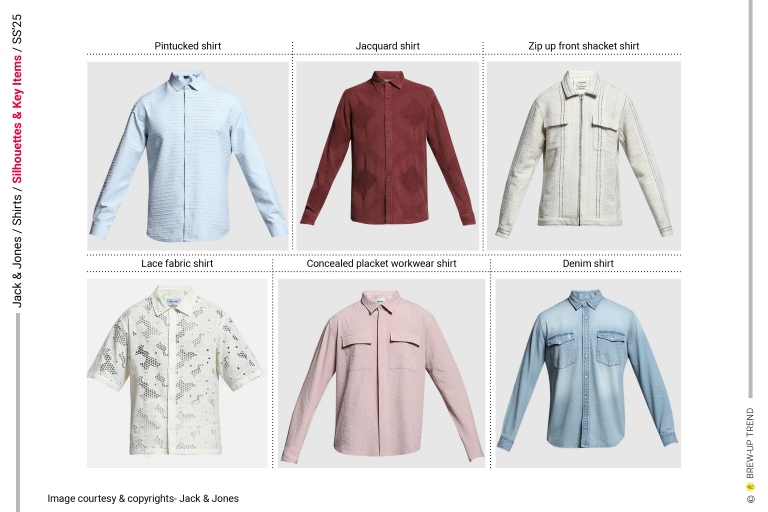 Prominent pieces include basic full sleeve and half shirt, striped shirt, resort /cuban collar shirt, buttoned down collar check shirt, all over printed shirts, textured knit shirts, utility shirt, pin-tucked shirts, jacquard shirts, zip front sachket shirt, lace fabric or schiffli shirt, concealed placket work wear shirt, denim shirts .