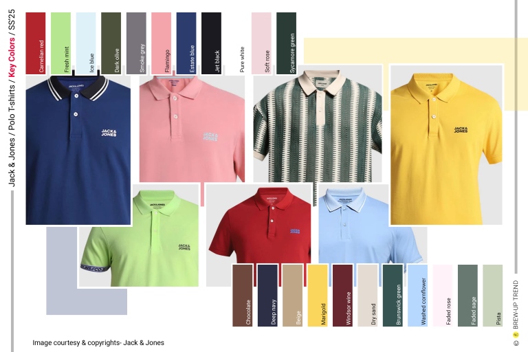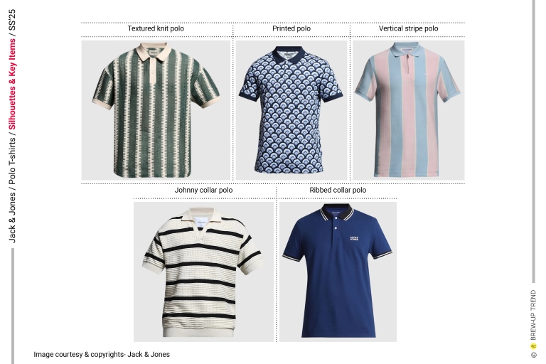 Jack and Jones Spring Summer 2025 Polo T-shirt direction captures a refined intersection of heritage leisurewear and modern athleisure, where surface intelligence and collar architecture drive commercial distinction. The story balances resort nostalgia and street-aware polish, anchored in Cuban-inspired vintage narratives, Art Deco geometry, and contemporary sport detailing. Visual interest is created through engineered knits, tactile rib accents, and subtle yet deliberate contrasts. There is a strong emphasis on texture over print saturation, with jacquards knits, piqués, and coarser knit structures replacing flat jersey basics. Color is treated with restraint and clarity, oscillating between sun-faded pastels, grounded naturals, and confident saturated brights. Branding remains playful yet controlled, often stylised, numeric, or typographic, reinforcing a youthful but premium sensibility. Overall, the collection speaks to a consumer seeking elevated casual polos that transition seamlessly between resort, city, and relaxed social settings, without sacrificing design depth or material richness.
