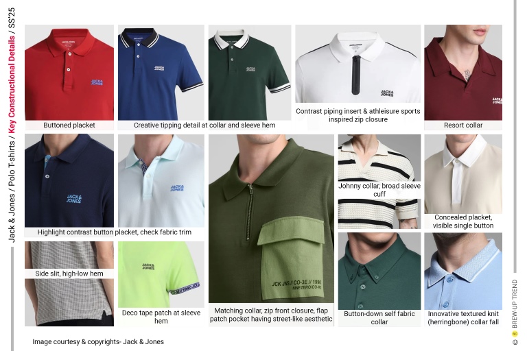 Key Constructional Details include Buttoned placket, tipping detail at collar and sleeve hems, contrast piping insert, zip closure, resort collar with concealed placket and visible button, herringbone textured knit collar, button-down self-fabric collar, Johnny collar, broad sleeve cuff, zip-front closure, flap patch pocket, contrast button placket, checkered fabric trim, side slit hem, high-low hem, deco tape patch at sleeve.
