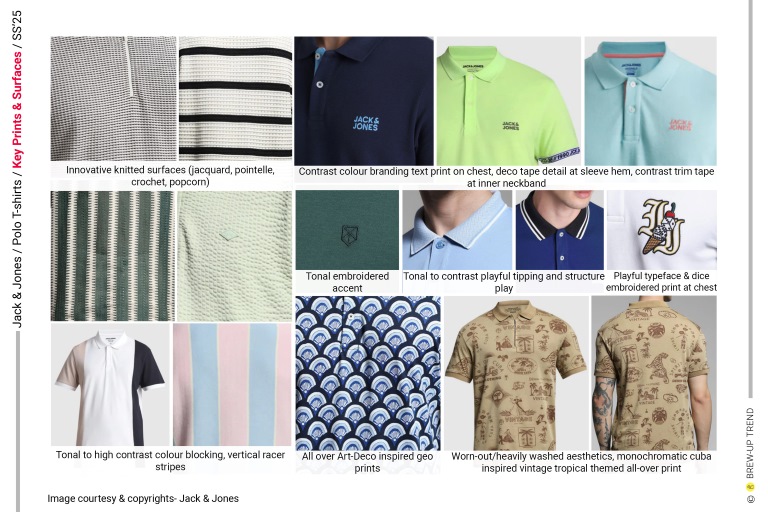 Key Prints and Surfaces include – Innovative knitted surfaces (jacquard, Pointtle, chrocet, popcorn),tonal to high contrast color blocking, vertcle racer stripes, all over Art-Deco inspired geo prints, wornout/heavily washed aetheics, monochromatic cuba inspred vintage tropical themed all over print, contrast color branding text prints on chest, deco tape detail at sleeve hem, contrast trim tape at inner neck band, tonal embroidered accent, tonal to contrast playfull tipping and structure play, playful typeface and dice embroidered print at chest.