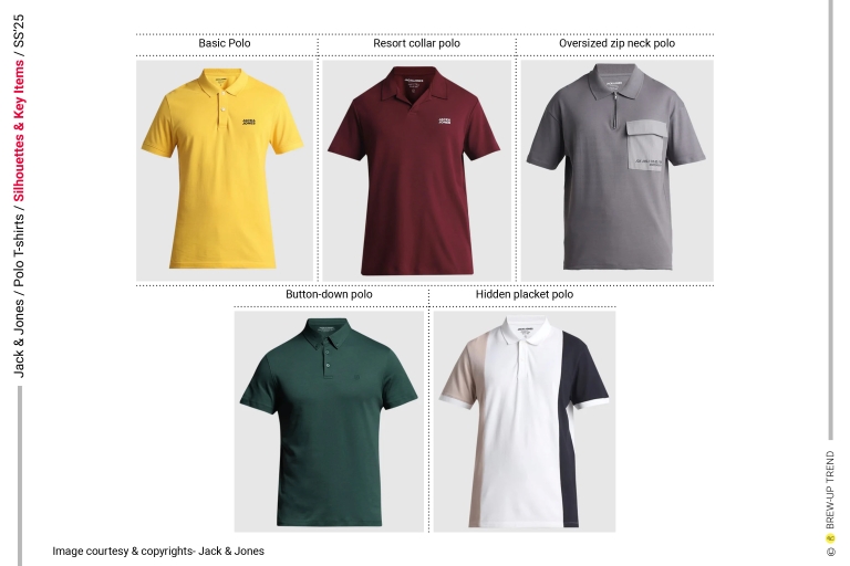 Silhouettes evolve through a considered balance of structure and ease, anchored in regular-to-relaxed fits that prioritise comfort while maintaining a refined profile. Resort-led shapes adopt slightly looser volumes with relaxed shoulder lines, creating an effortless, summer-oriented stance. Overall, the direction focuses on adaptable, silhouette-driven polos that transition seamlessly between casual and elevated wardrobes. Key statement pieces emerge through Basic Polos, Resort Collar Polos, Oversized Zip Neck Polos, Button-Down Polos, Hidden Placket Polos, Vertical Stripe Polos, Johnny Collar Polos and Ribbed Collar Polos.