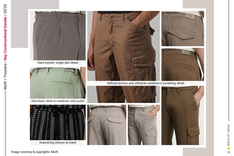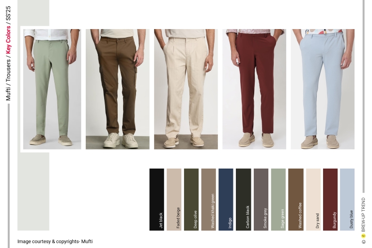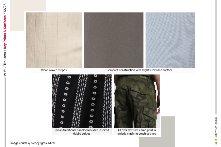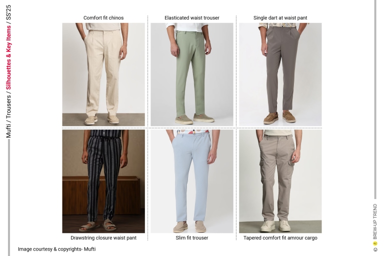 Mufti’s Spring/Summer 2025 trousers collection presents a grounded, function-led menswear trouser narrative that balances everyday wearability with refined utilitarian polish. The collection draws inspiration from modern urban lifestyles where comfort, adaptability, and understated utility intersect, reflecting a season focused on practical elegance rather than expressive excess. The dominant silhouette language is relaxed, tapered, and comfort-driven that feel contemporary and versatile. Construction approaches favor pragmatic interventions such as elasticated waist inserts, single dart shaping, and drawstring closures that privilege adjustability and wearer agency over rigid tailored structures. Print and surface directions remain restrained yet characterful, using texture, stripe articulation, and abstract camouflage to add depth rather than visual noise. The direction oscillates between compact woven plains with subtle textural interest. The overall colour aesthetic communicates calm, grounded sophistication with a muted, natural mood that supports seasonless layering and extended wardrobe relevance. Fabric compositions are explicitly indicated through cotton, cotton-lycra blends, polyester, and polyester-viscose constructions.