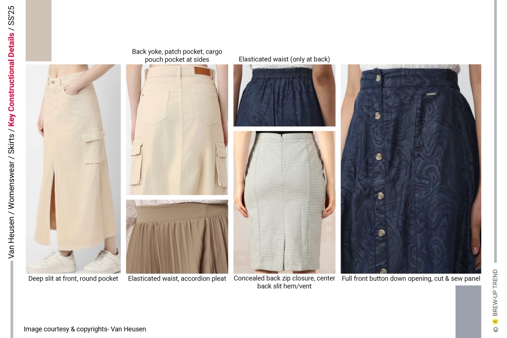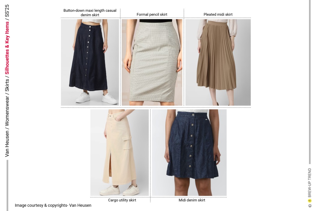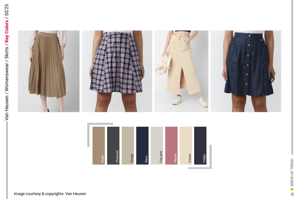 Van Heusen SS’25 Women’s Skirts Collection articulates a refined balance between fluid volume and tailored restraint, transitioning seamlessly across softly flared midi lengths, sharply structured pencil silhouettes, and elongated casual A-line forms. The construction language remains disciplined and intentional, prioritising functional detailing over overt embellishment.