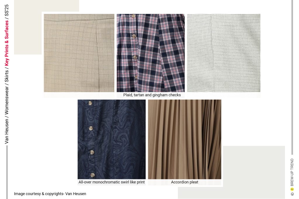 The surface direction varies from subtle textures to all-over abstract prints. Plaid checks appear on select silhouettes, maintaining a refined workwear orientation. Glen plaid on a neutral ground is featured on the formal pencil skirt. Denim fabrics appear occasionally. Other prominent prints and surface details include small-scale houndstooth checks, all-over tonal swirl-like monochromatic prints, and accordion pleats. Fabric textures remain smooth and minimally embellished overall, with no visible embroidery or appliqué.