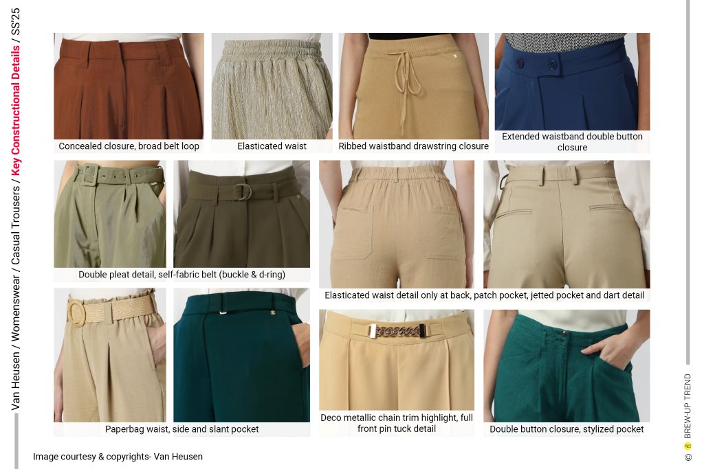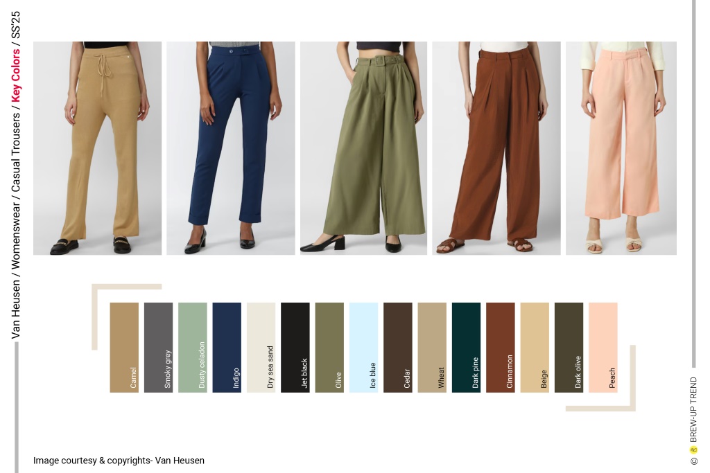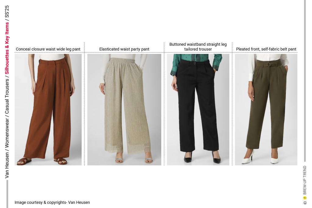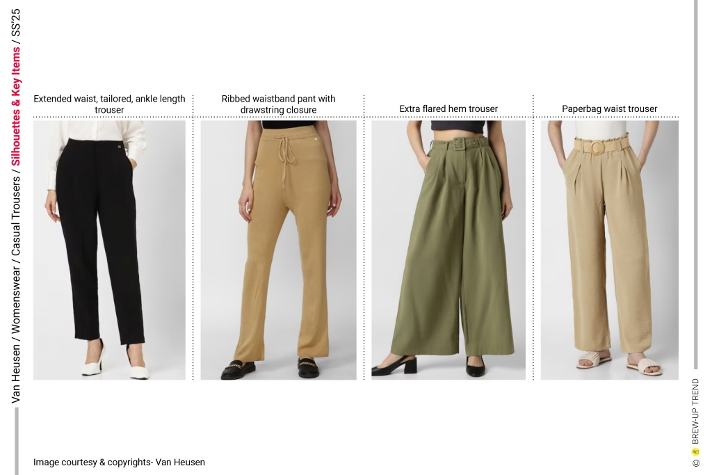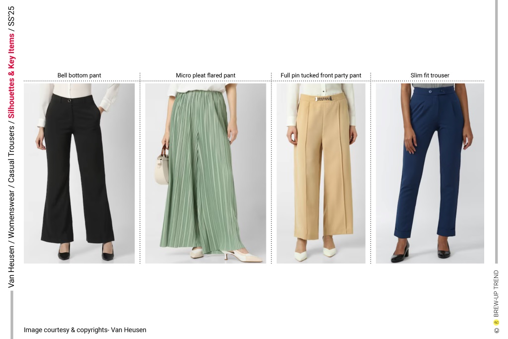 For Spring/Summer 2025, Van Heusen’s women’s casual trousers collection is anchored in a dual narrative of elevated ease and considered structure. The collection balances elongated wide-leg volumes with calibrated straight and slim profiles, creating a proportional dialogue between ease and precision. Waist treatments emerge as a focal design axis, ranging from clean tailored finishes to elasticated and paperbag constructions, reinforcing versatility across work and resort contexts. Surface expression remains restrained yet texturally nuanced, incorporating micro-pleated finishes, subtle weave variations, and abstract tonal patterning.