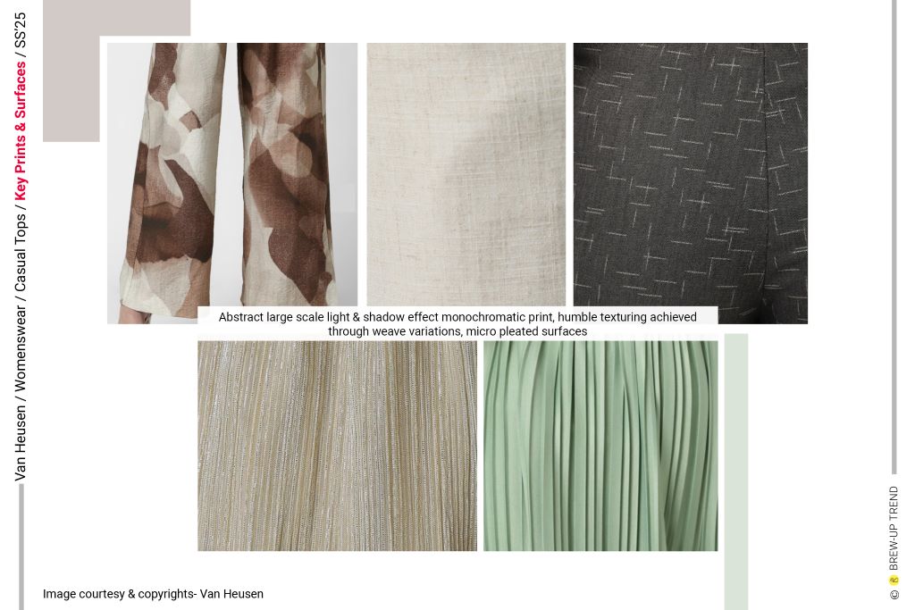Surface direction remains controlled and tonal. A large-scale abstract pattern, rendered through blended light and shadow effects, appears in a monochromatic brown palette, creating a soft-edged, organic camouflage impression. Elsewhere, texture is achieved through weave variations, visible as subtle irregular crosshatch effects and lightly slubbed surfaces. Micro-pleated constructions generate fine vertical ridging across full-length trousers, enhancing fluidity and light reflection. Pin-tuck detailing introduces engineered linear definition without the use of contrasting colour. Overall, prints are minimal and strategically placed, while surface interest relies on pleating, weave irregularity, and tonal pattern layering rather than overt graphic contrast.