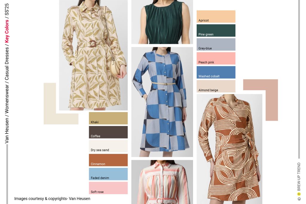 The palette is built on a calm, natural foundation of ecru, raw off-white, and blush nude, which serve as the base for most printed styles and the sole colour across several plain pieces. Terracotta and burnt sienna bring warmth and depth. Cobalt blue and soft slate are the coolest and boldest tones in the range, concentrated in the checkerboard-print dress. Coral and soft salmon run through the stripe and bird-scatter stories, joined by warm ochre and straw as quieter accent tones. Moss olive and khaki appear across the botanical leaf-print styles, grounding the nature references in a muted, earthy register. The dot-print shirt dress is the collection’s single high-contrast moment, using optic white and carbon black together for a sharp, graphic result.