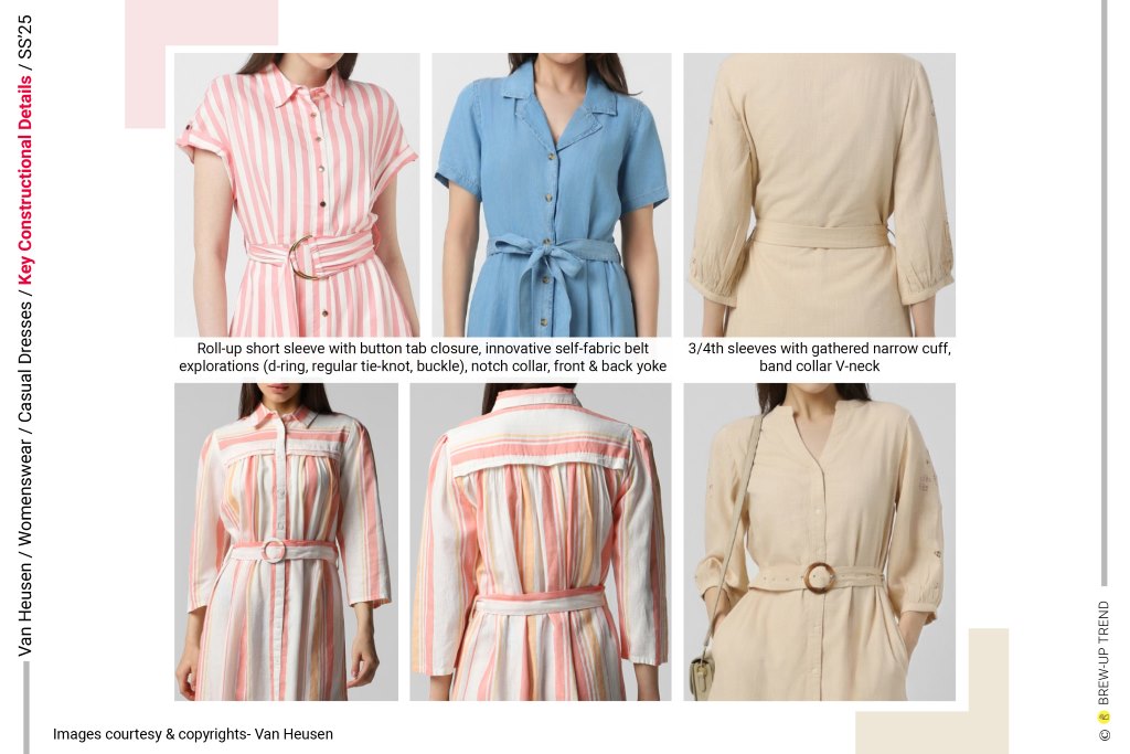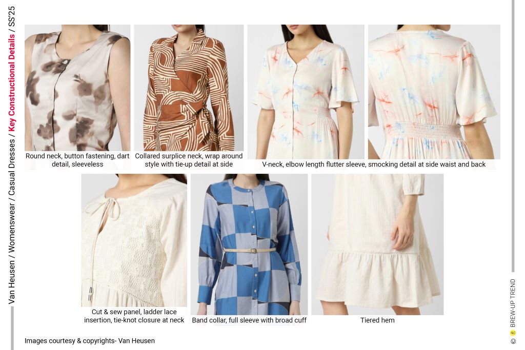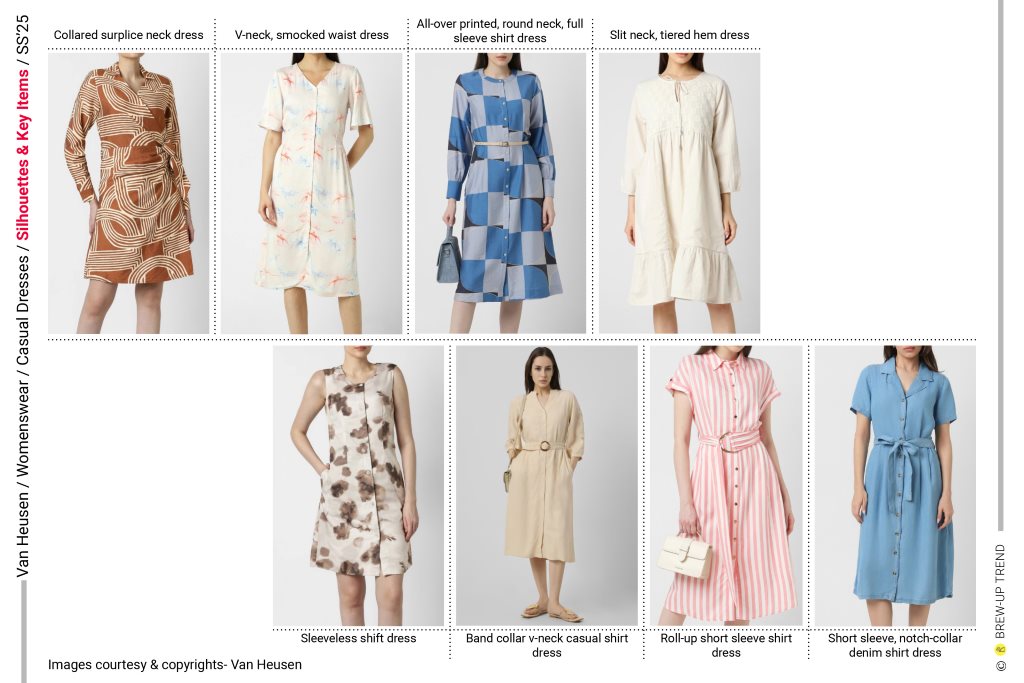 Key silhouettes include the sleeveless column dress; V-neck smocked-waist dress; collared surplice-neck dress with side-tie fastening; slit-front, three-quarter-sleeve empire-line tiered ruffle-hem dress; full-sleeve, classic-collar all-over print shirt dress; short sleeve notch-collar denim shirt dress; rollup short sleeve shirt dress , sleeveless shift dress, band-collar V-neck casual day dress.