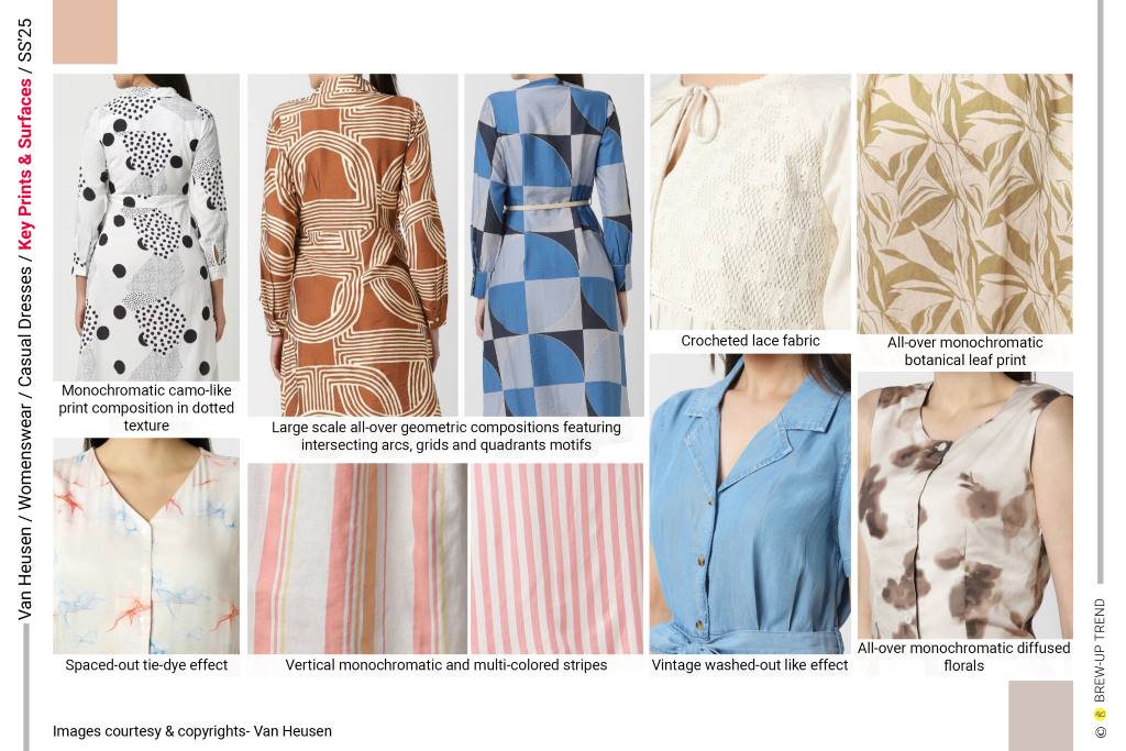 Surface direction shifts between bold graphic statements and softer, organic expressions. Large-scale geometric compositions feature intersecting arcs, grids, and quadrant motifs arranged in repeat. Vertical monochromatic and multi-coloured multi-stripe patterns and painterly floral prints appear diffused and slightly irregular tie-dye effect, with soft-edged, blotched motifs scattered across light grounds. Botanical leaf prints are rendered in all-over placements, scaled to a medium proportion and thoughtfully aligned with garment panels to avoid any directional disruption. Denim styles appears in vintage washed out effect surfaces.
